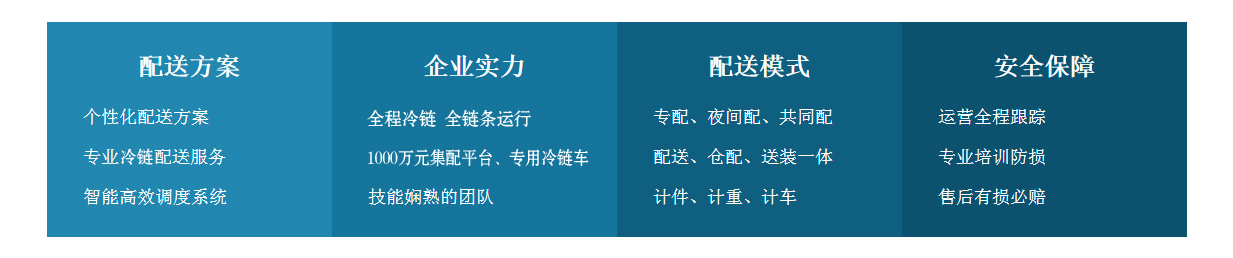 公司建設(shè)集配平臺(tái)和專用冷鏈車,發(fā)揮冷鏈物流特色,實(shí)現(xiàn)農(nóng)產(chǎn)品、醫(yī)藥、鮮花、食品、冷鮮產(chǎn)品的智能配送,并通過(guò)物聯(lián)網(wǎng)及云平臺(tái)系統(tǒng)實(shí)現(xiàn)全程追溯式管理,提供“最后一公里”解決方案。全程冷鏈,全鏈條運(yùn)行,為千家萬(wàn)戶提供安全放心食品。