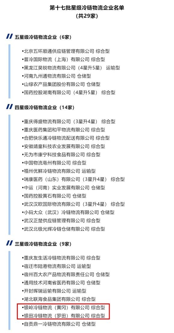 2月5日,中國物流與采購聯(lián)合會官網發(fā)布了第十七批星級冷鏈物流企業(yè)公示,銀嶺冷鏈物流(黃岡)有限公司、銀田冷鏈物流(羅田)有限公司通過了全國三星級冷鏈物流企業(yè)(綜合型)評審。 依據(jù)《物流企業(yè)冷鏈服務要求與能力評估指標》(GB/T 31086-2014)國家標準和中國物流與采購聯(lián)合會冷鏈物流企業(yè)星級評估的相關制度辦法,按照企業(yè)自檢、申請、審核、現(xiàn)場評估、審定和公示等規(guī)范的評估程序,從企業(yè)的設施設備、信息化和管理與服務三個方面,按照公平、公開、公正的原則開展了第十七批星級冷鏈物流企業(yè)服務能力的評估。